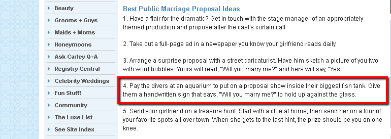 Now, if the divers say, “Proposal show? Is that a thing?” or, “We don’t really do that. This is an aquarium, not a baseball stadium.” Then you should probably scrap the whole engagement thing, because, really. You’re a grown man and you can’t even bribe a diver into helping you with your aquarium proposal.