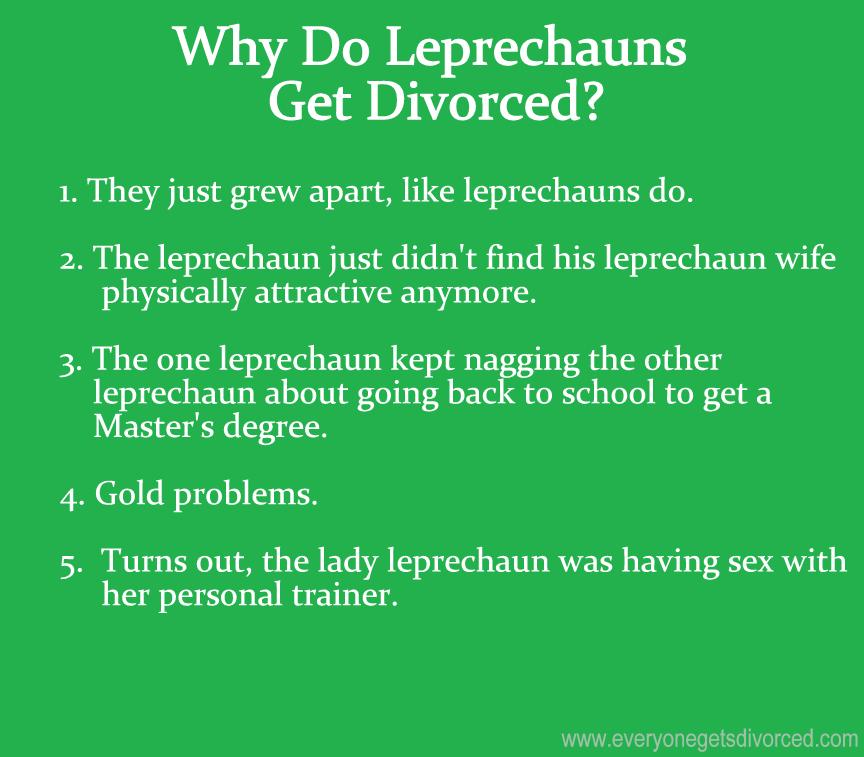 We talk a lot about human divorce on this blog. And public opinion tells us that we talk too much about duck divorce. But in honor of the upcoming holiday, we’re going to answer the burning question that we assume is on everyone’s mind: WHY DO LEPRECHAUNS GET DIVORCED?